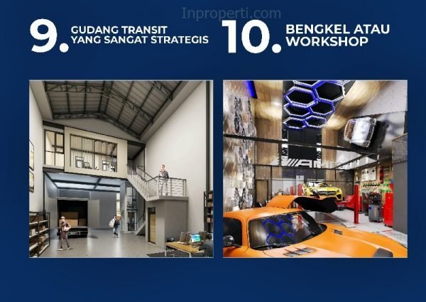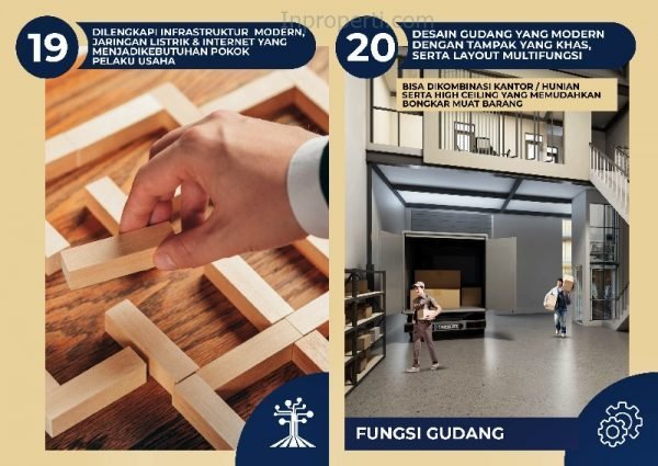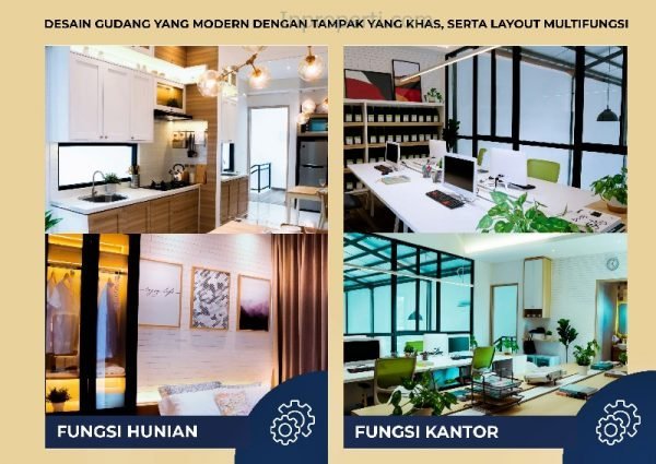 - Desain Gudang yang modern dengan tampak yang khas serta layout multifungsi, bisa di kombinasi kantor / hunian, serta high ceiling yang memudahkan bongkar muat barang.